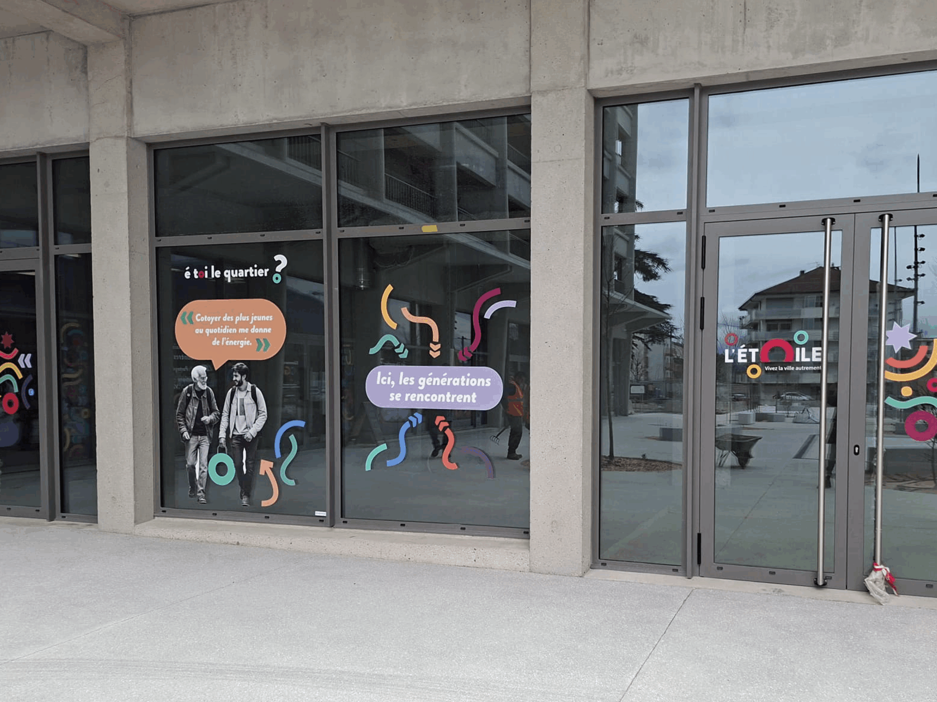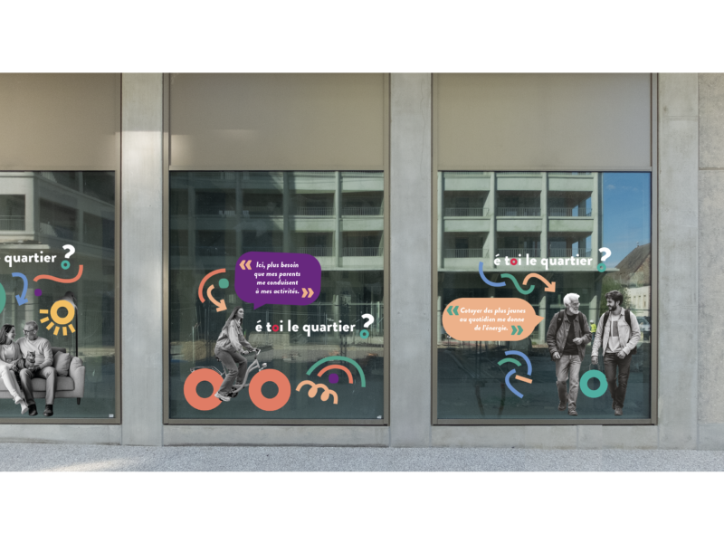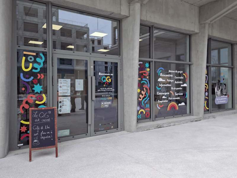 Notre mission, habiller les vitrines des locaux en bas d’immeuble pour animer le quartier avant l’arrivée des commerçants et décliner la création également sur les vitrines du Tiers-lieu.
